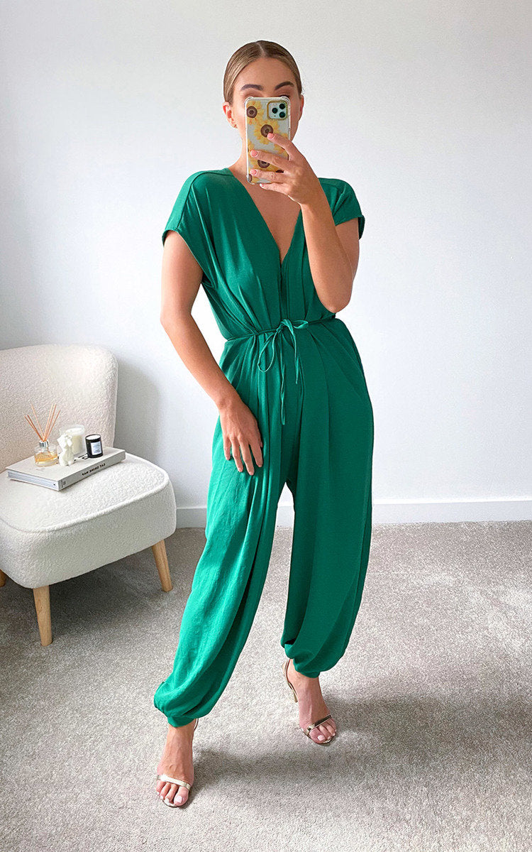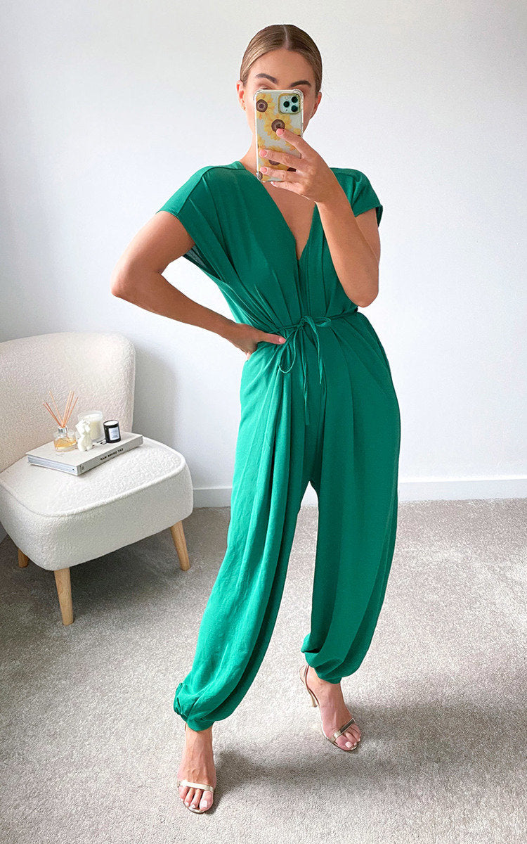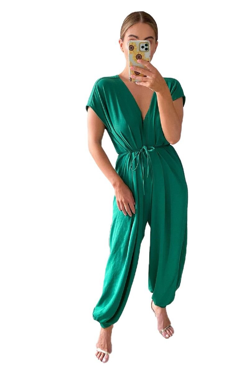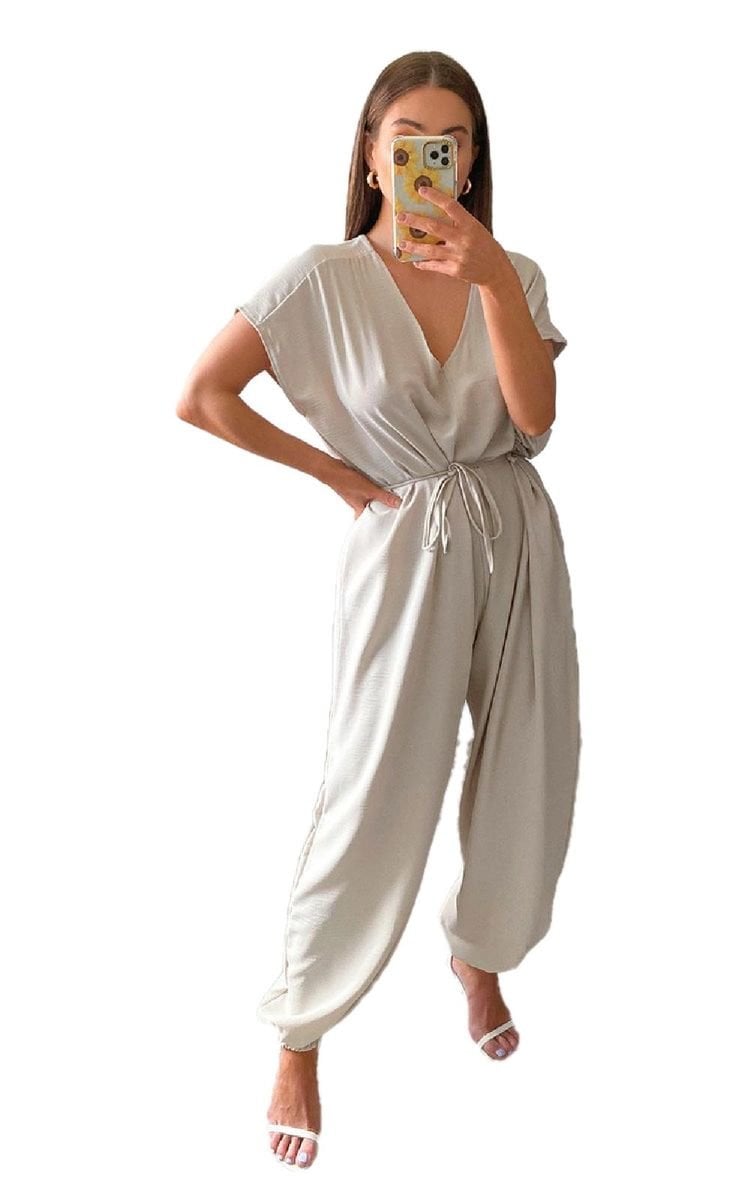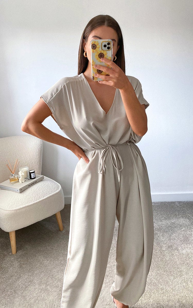 our GWYNETH jumpsuit features oversized trouser, v neckline with sleeveless design. Style with Summer sandals and gold accessories for a glam luxe look.