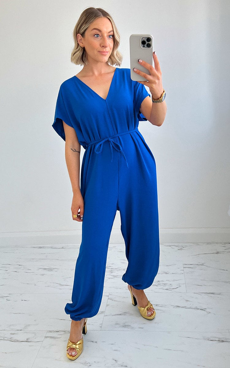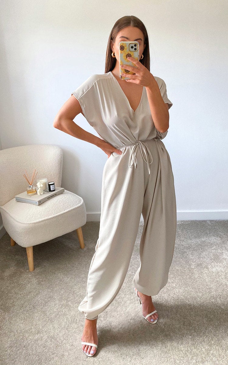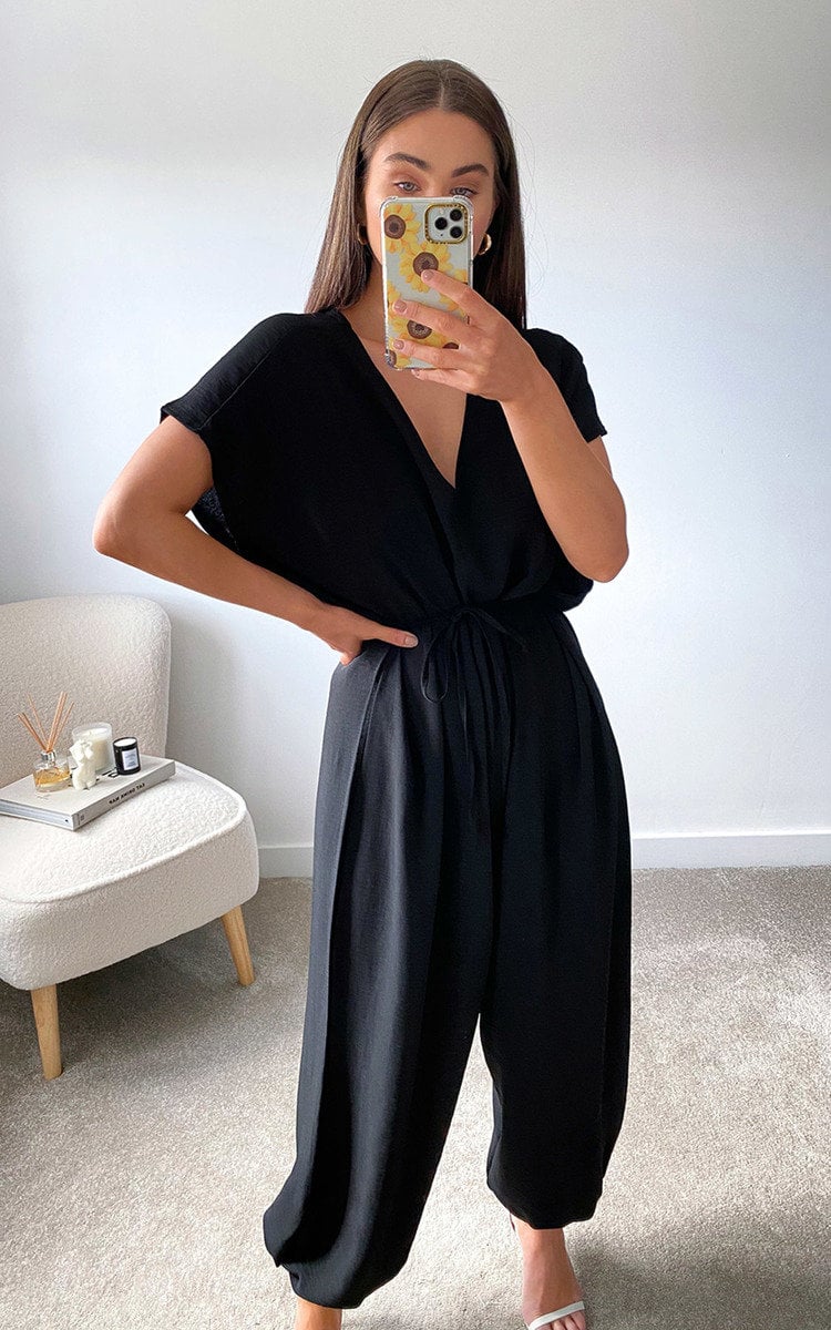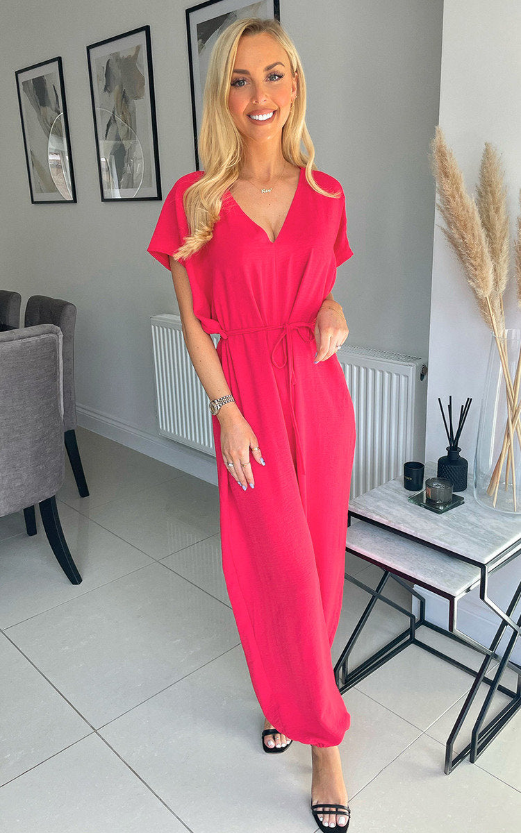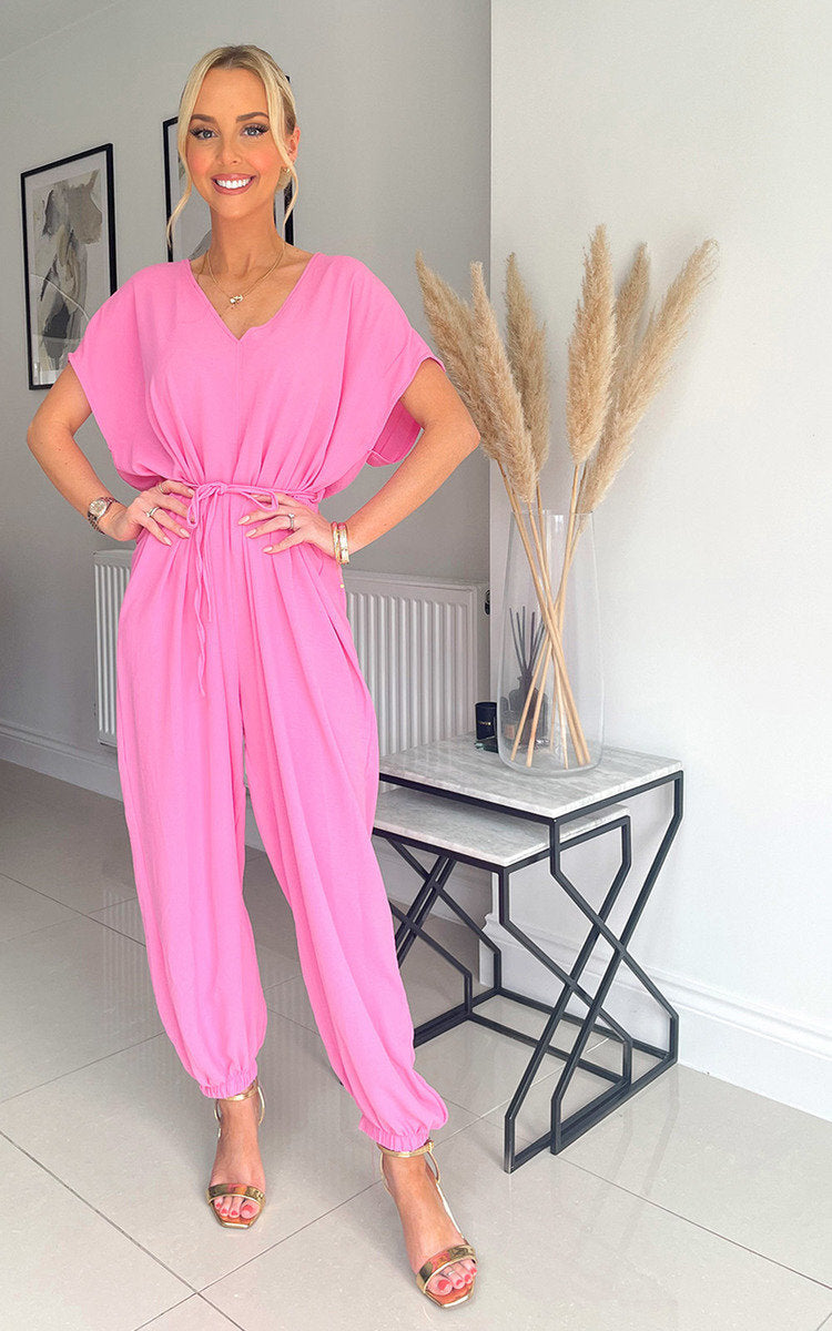 our GWYNETH jumpsuit features oversized trouser, v neckline with sleeveless design. Style with Summer sandals and gold accessories for a glam luxe look.