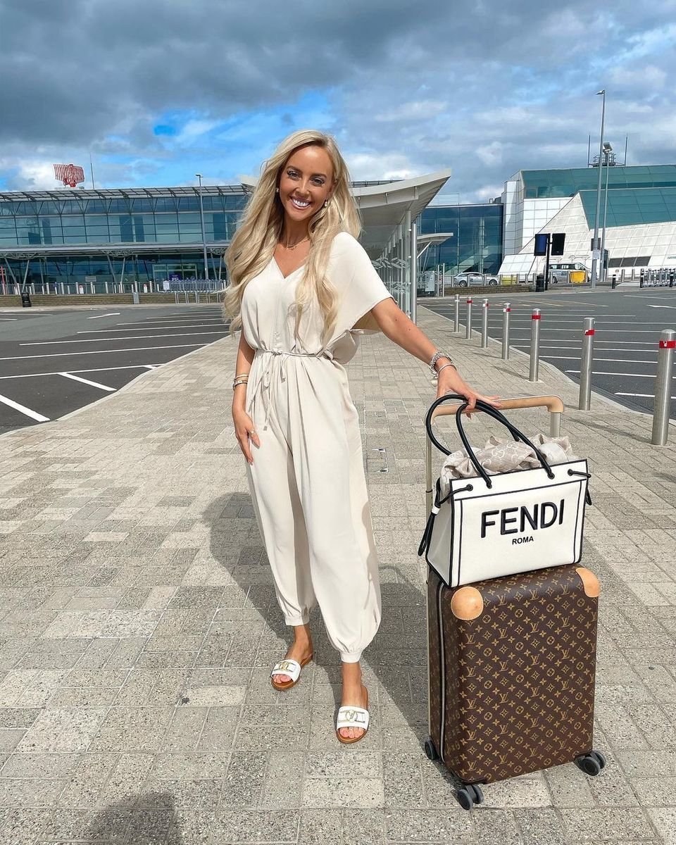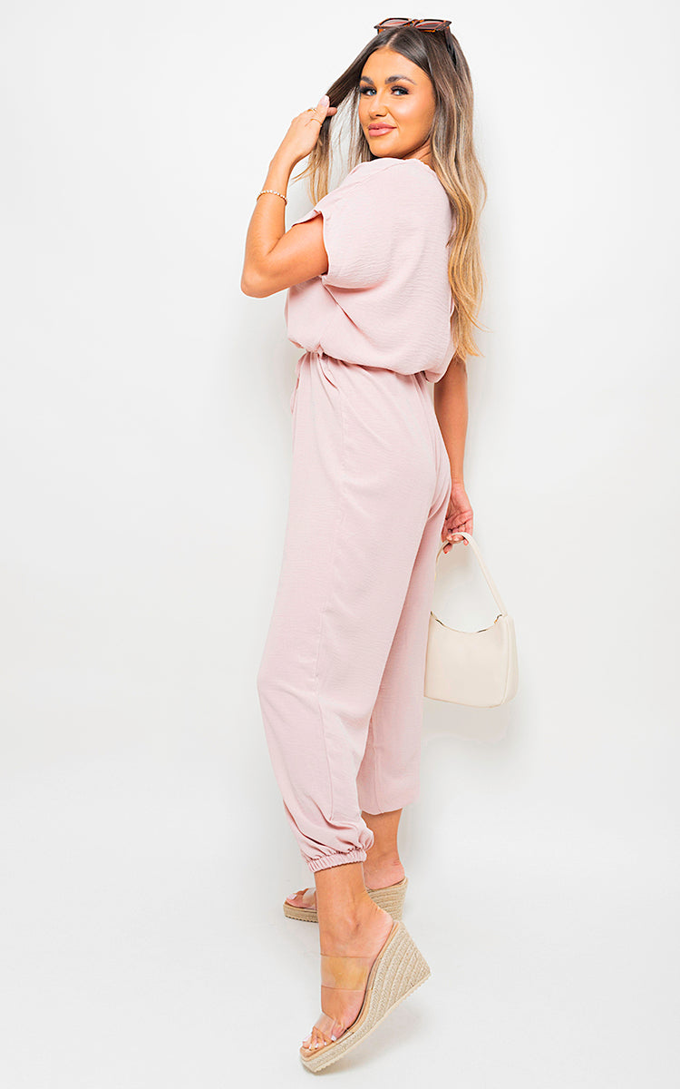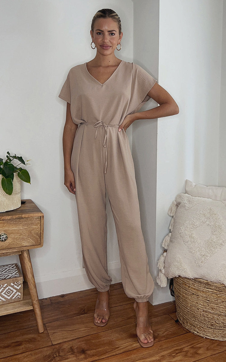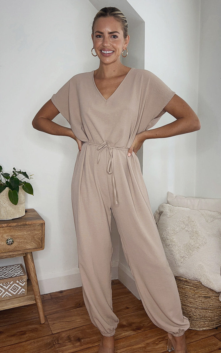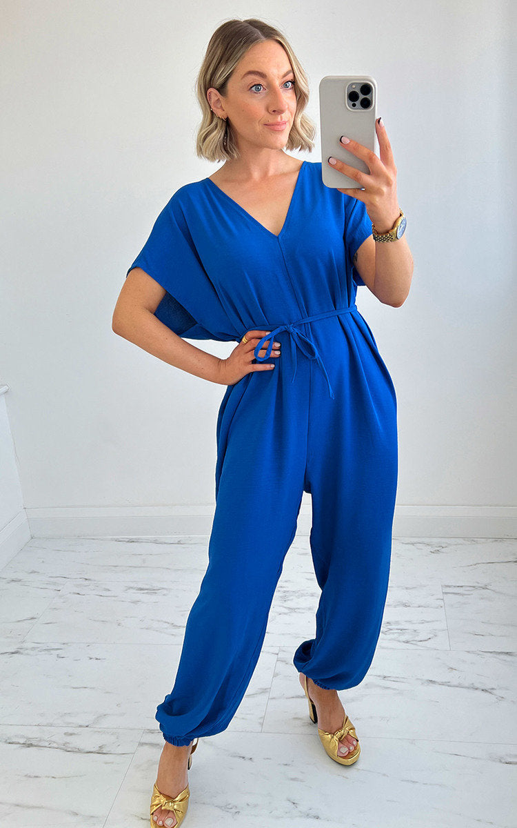 our GWYNETH jumpsuit features oversized trouser, v neckline with sleeveless design. Style with Summer sandals and gold accessories for a glam luxe look.