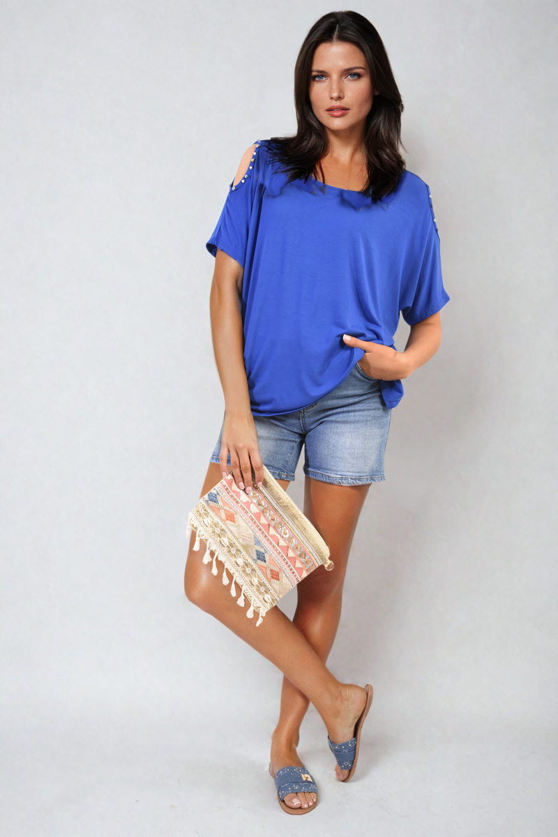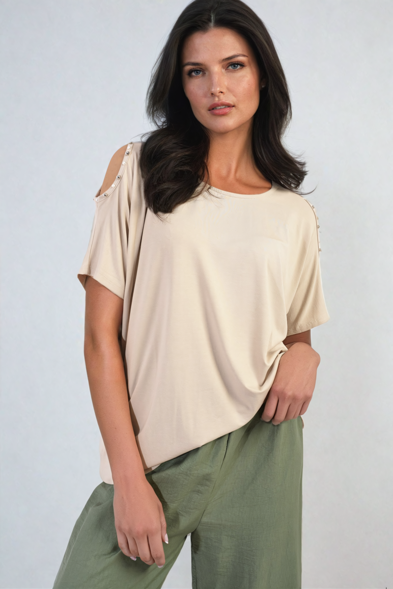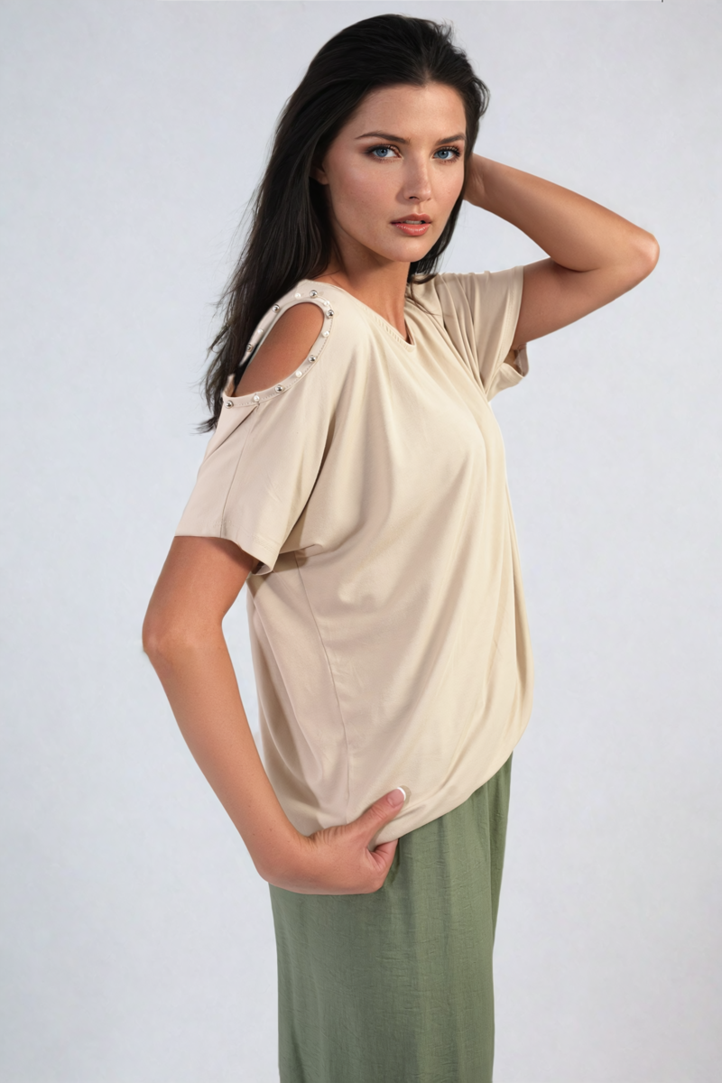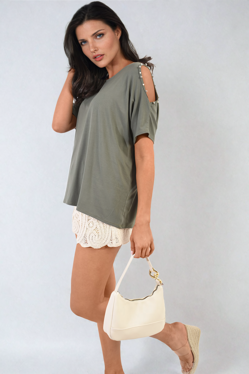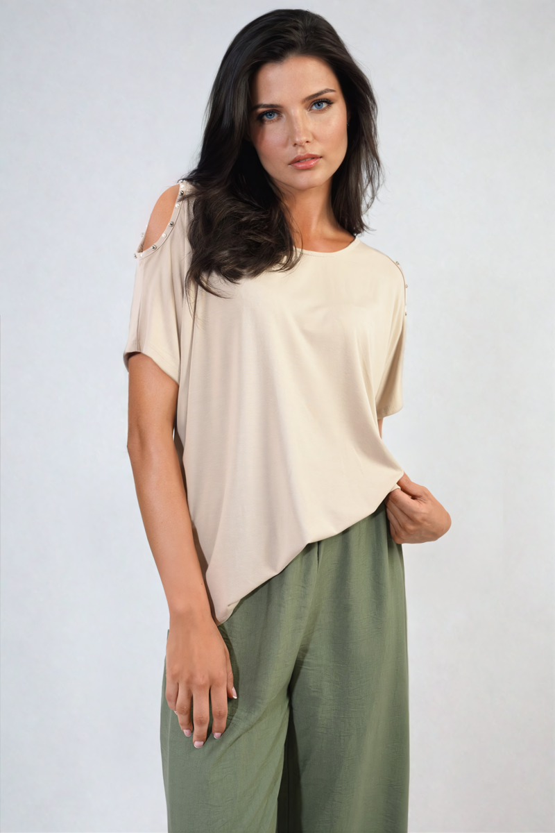 The Mylah Pearl Cold Shoulder Top is a stylish and elegant option. It features cold-shoulder cutouts and pretty pearl accents, adding a touch of sophistication to your outfit. Ideal for dressing up or down, this top gives a chic, modern look with a hint of glamour.
