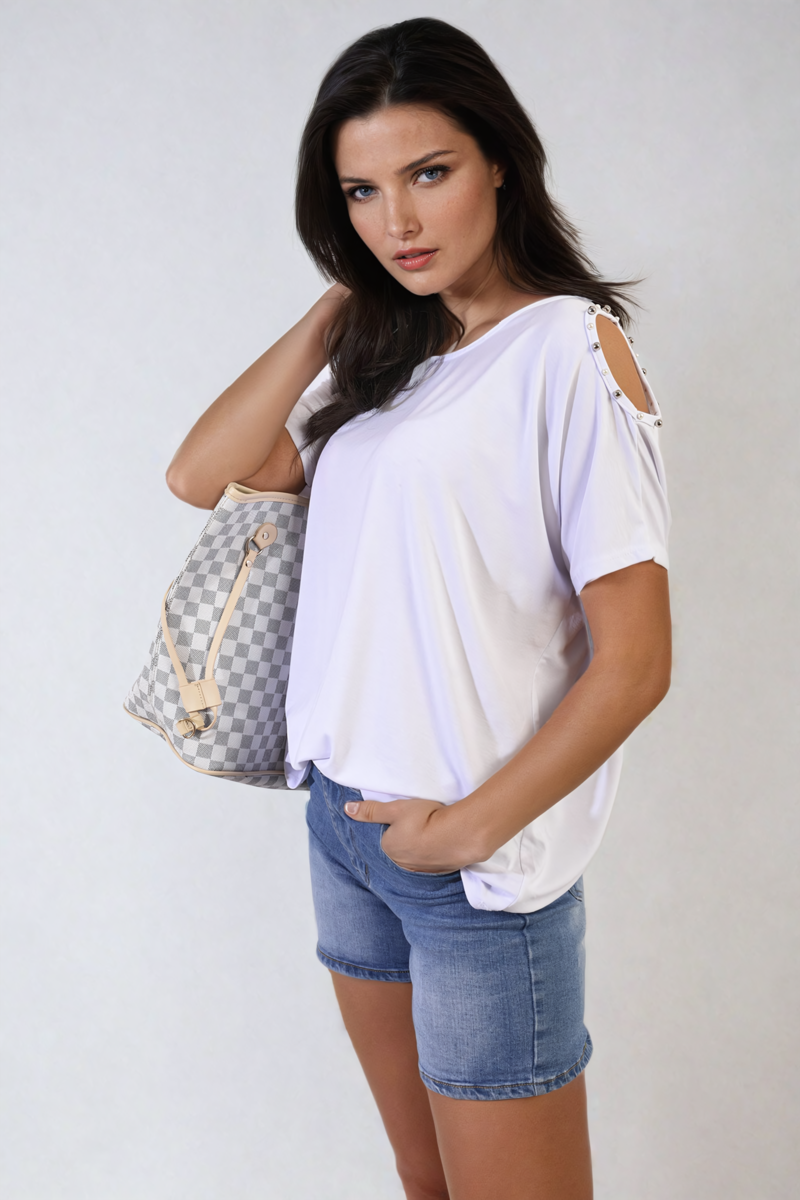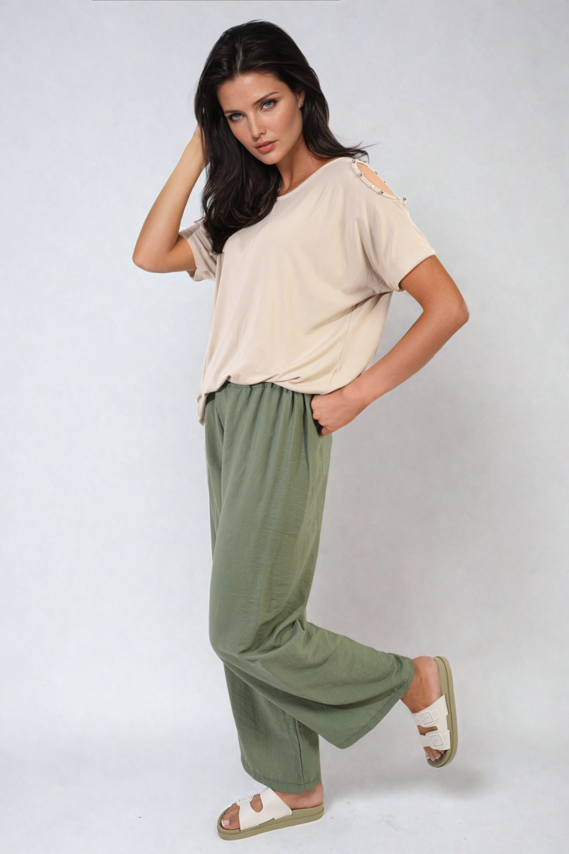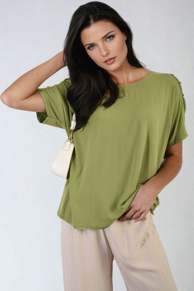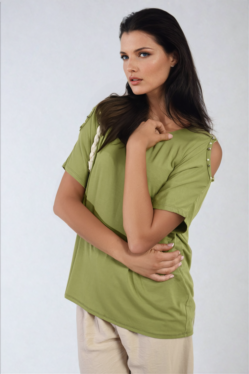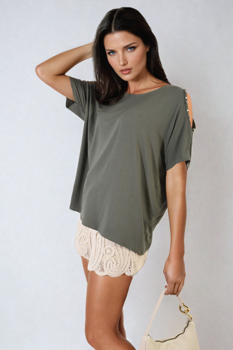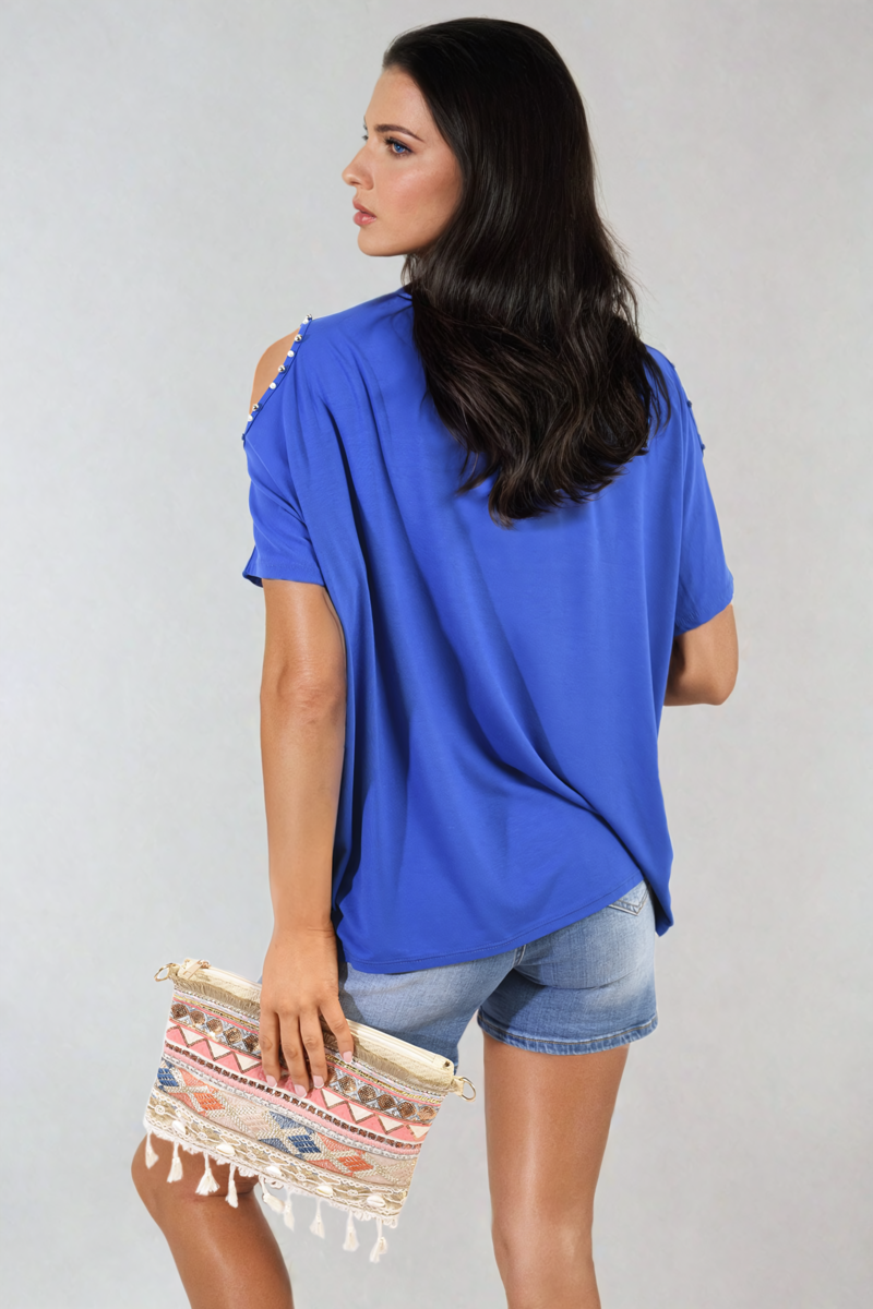 The Mylah Pearl Cold Shoulder Top is a stylish and elegant option. It features cold-shoulder cutouts and pretty pearl accents, adding a touch of sophistication to your outfit. Ideal for dressing up or down, this top gives a chic, modern look with a hint of glamour.